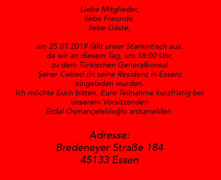am 25.01.2019 fällt unser Stammtisch aus, da wir an diesem Tag, um 18:00 Uhr, zu dem Türkischen Generalkonsul Şener Cebeci (in seine Residenz in Essen) eingeladen wurden.